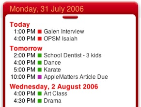 iCal has an annoying habit of coming to the fore when you click on alarm. Therefore, I usually don’t have iCal running. Instead, to quickly and easily see a list of my up coming appointments, I use the iCal Events widget. Configurable options are: The number of days in advance to show (I use 8, which I find works without overflowing my screen); and the calendars to show.