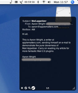 The idea is simple. You receive an e-mail and a customizable notification is displayed on your desktop for a short period. The notification previews the e-mail, showing you who sent it, which e-mail account it was sent to and, if the sender has activated it, a display picture. Rolling your cursor over the display will show you four buttons at the bottom allowing you to Close the window, Delete message, Open message in Mail and set e-mail as ‘read’. A very handy way to read your e-mails without opening up Mail.